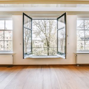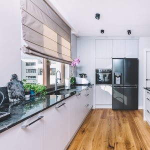Modern kitchen interior design. Wooden floor and quartzite tabletop